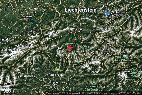 Lieve Terremoto di magnitudo M2.1 registrato alle 17:42:58 (ora locale Italiana – 16:42:58 UTC) di oggi con epicentro “Confine Italia-Svizzera (SVIZZERA) Latitudine: 46.6 Longitudine: 9.33 mostrato sulla mappa.