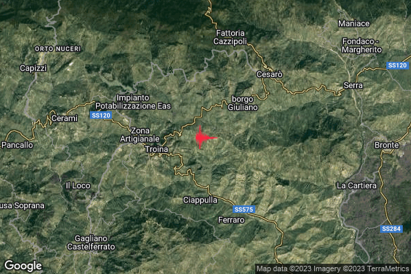 Lieve Terremoto di magnitudo M2.1 registrato alle 08:00:11 (ora locale Italiana – 06:00:11 UTC) di oggi con epicentro “4 km E Troina (EN) Latitudine: 37.79 Longitudine: 14.65 mostrato sulla mappa.