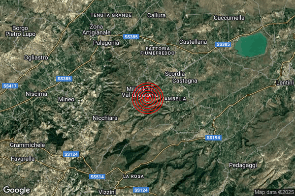 Oggi 12/10/2025 alle ore 03:59:54 (ora locale Italiana – 01:59:54 UTC) è stato registrato un Debole #Terremoto di magnitudo M2.5 con epicentro “1 km SE Militello in Val di Catania (CT)” Latitudine: 37.27 Longitudine: 14.8 mostrato sulla mappa.