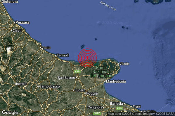 Oggi 17/12/2025 alle ore 12:38:06 (ora locale Italiana – 11:38:06 UTC) è stato registrato un Lieve #Terremoto di magnitudo M2.0 con epicentro “Costa Garganica (Foggia)” Latitudine: 41.97 Longitudine: 15.59 mostrato sulla mappa.