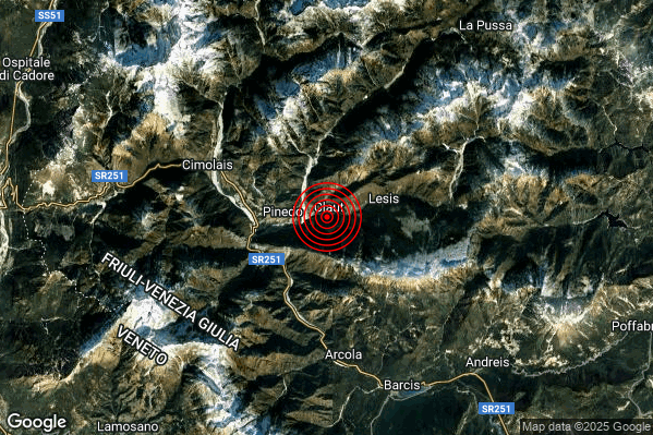 Oggi 19/12/2025 alle ore 21:45:39 (ora locale Italiana – 20:45:39 UTC) è stato registrato un Leggero #Terremoto di magnitudo M3.0 con epicentro “Claut (PN)” Latitudine: 46.26 Longitudine: 12.51 mostrato sulla mappa.