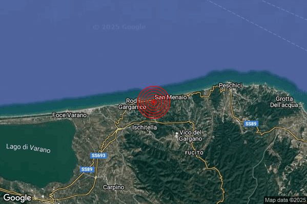 Oggi 23/12/2025 alle ore 09:31:20 (ora locale Italiana – 08:31:20 UTC) è stato registrato un Debole #Terremoto di magnitudo M2.5 con epicentro “2 km E Rodi Garganico (FG)” Latitudine: 41.93 Longitudine: 15.91 mostrato sulla mappa.