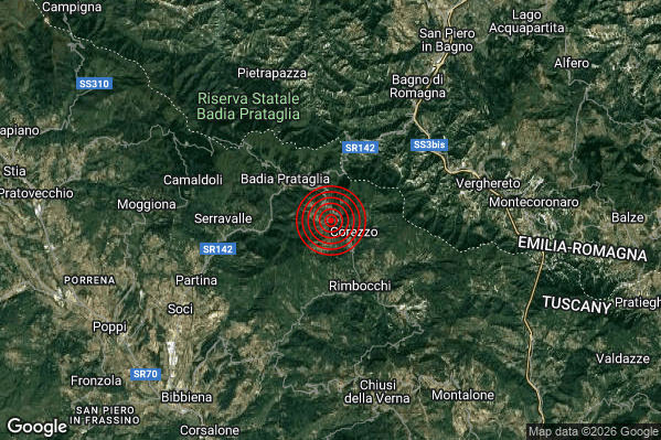 Oggi 02/01/2026 alle ore 20:53:10 (ora locale Italiana – 19:53:10 UTC) è stato registrato un Moderato #Terremoto di magnitudo M3.5 con epicentro “8 km W Verghereto (FC)” Latitudine: 43.78 Longitudine: 11.91 mostrato sulla mappa.