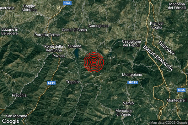 Oggi 02/01/2026 alle ore 23:02:42 (ora locale Italiana – 22:02:42 UTC) è stato registrato un Leggero #Terremoto di magnitudo M3.1 con epicentro “6 km E Sambuca Pistoiese (PT)” Latitudine: 44.11 Longitudine: 11.08 mostrato sulla mappa.