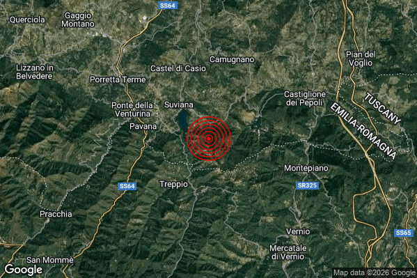 Oggi 03/01/2026 alle ore 15:45:23 (ora locale Italiana – 14:45:23 UTC) è stato registrato un Debole #Terremoto di magnitudo M2.7 con epicentro “5 km E Sambuca Pistoiese (PT)” Latitudine: 44.11 Longitudine: 11.07 mostrato sulla mappa.