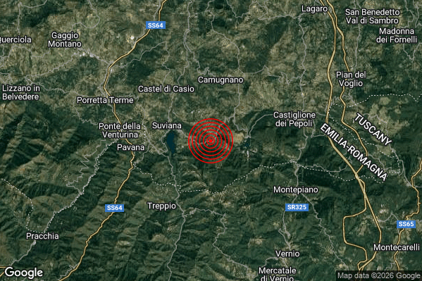 Oggi 03/01/2026 alle ore 20:56:42 (ora locale Italiana – 19:56:42 UTC) è stato registrato un Lieve #Terremoto di magnitudo M2.0 con epicentro “5 km S Camugnano (BO)” Latitudine: 44.13 Longitudine: 11.08 mostrato sulla mappa.
