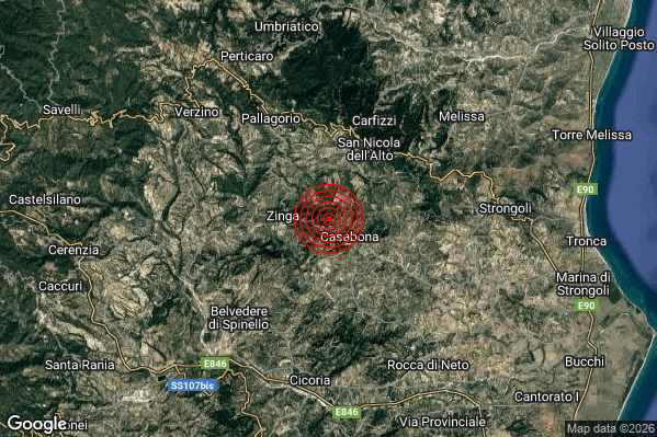Oggi 05/01/2026 alle ore 11:21:39 (ora locale Italiana – 10:21:39 UTC) è stato registrato un Lieve #Terremoto di magnitudo M2.0 con epicentro “2 km NW Casabona (KR)” Latitudine: 39.26 Longitudine: 16.94 mostrato sulla mappa.
