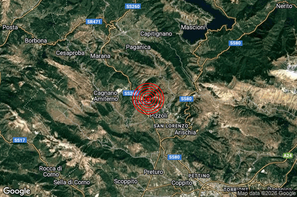 Oggi 11/01/2026 alle ore 11:39:33 (ora locale Italiana – 10:39:33 UTC) è stato registrato un Lieve #Terremoto di magnitudo M2.2 con epicentro “1 km E Barete (AQ)” Latitudine: 42.45 Longitudine: 13.29 mostrato sulla mappa.