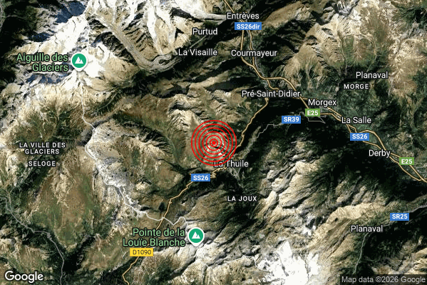 Oggi 12/01/2026 alle ore 07:28:49 (ora locale Italiana – 06:28:49 UTC) è stato registrato un Moderato #Terremoto di magnitudo M3.4 con epicentro “2 km NW La Thuile (AO)” Latitudine: 45.73 Longitudine: 6.93 mostrato sulla mappa.