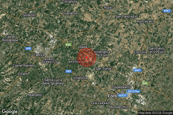 Oggi 13/01/2026 alle ore 09:29:17 (ora locale Italiana – 08:29:17 UTC) è stato registrato un Distinto #Terremoto di magnitudo M4.1 con epicentro “8 km E Faenza (RA)” Latitudine: 44.29 Longitudine: 11.98 mostrato sulla mappa.