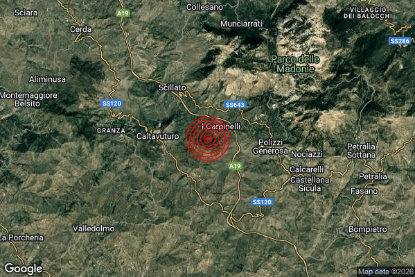 Oggi 15/01/2026 alle ore 03:08:42 (ora locale Italiana – 02:08:42 UTC) è stato registrato un Lieve #Terremoto di magnitudo M2.2 con epicentro “4 km E Caltavuturo (PA)” Latitudine: 37.82 Longitudine: 13.94 mostrato sulla mappa.