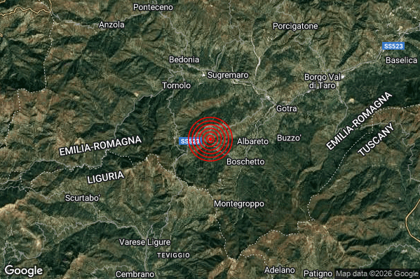 Oggi 16/01/2026 alle ore 10:53:43 (ora locale Italiana – 09:53:43 UTC) è stato registrato un Debole #Terremoto di magnitudo M2.4 con epicentro “4 km W Albareto (PR)” Latitudine: 44.45 Longitudine: 9.66 mostrato sulla mappa.