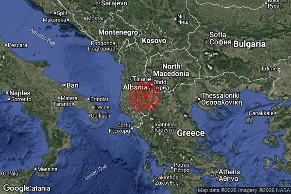 Oggi 16/01/2026 alle ore 11:28:51 (ora locale Italiana – 10:28:51 UTC) è stato registrato un Distinto #Terremoto di magnitudo M4.2 con epicentro “Albania [Land]” Latitudine: 40.72 Longitudine: 20.52 mostrato sulla mappa.