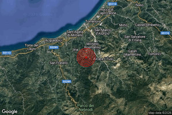 Oggi 19/01/2026 alle ore 02:12:43 (ora locale Italiana – 01:12:43 UTC) è stato registrato un Lieve #Terremoto di magnitudo M2.0 con epicentro “3 km SW Militello Rosmarino (ME)” Latitudine: 38.02 Longitudine: 14.66 mostrato sulla mappa.