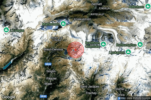 Oggi 20/01/2026 alle ore 21:21:44 (ora locale Italiana – 20:21:44 UTC) è stato registrato un Moderato #Terremoto di magnitudo M3.3 con epicentro “8 km NE Valtournenche (AO)” Latitudine: 45.93 Longitudine: 7.69 mostrato sulla mappa.