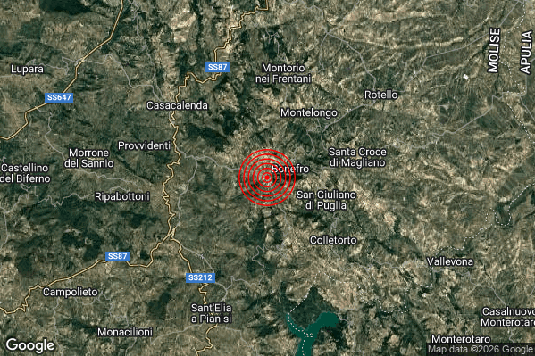 Oggi 21/01/2026 alle ore 11:47:38 (ora locale Italiana – 10:47:38 UTC) è stato registrato un Lieve #Terremoto di magnitudo M2.2 con epicentro “1 km W Bonefro (CB)” Latitudine: 41.7 Longitudine: 14.92 mostrato sulla mappa.