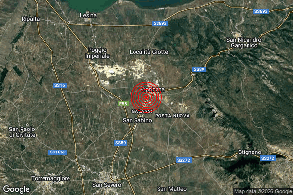 Oggi 21/01/2026 alle ore 16:46:02 (ora locale Italiana – 15:46:02 UTC) è stato registrato un Leggero #Terremoto di magnitudo M3.0 con epicentro “1 km SW Apricena (FG)” Latitudine: 41.78 Longitudine: 15.43 mostrato sulla mappa.