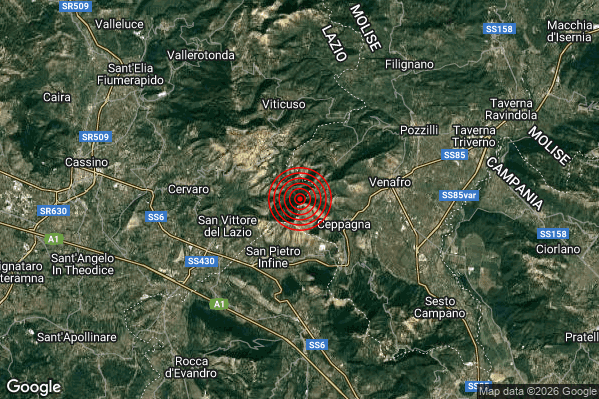 Oggi 22/01/2026 alle ore 01:38:03 (ora locale Italiana – 00:38:03 UTC) è stato registrato un Debole #Terremoto di magnitudo M2.5 con epicentro “3 km SW Conca Casale (IS)” Latitudine: 41.48 Longitudine: 13.98 mostrato sulla mappa.