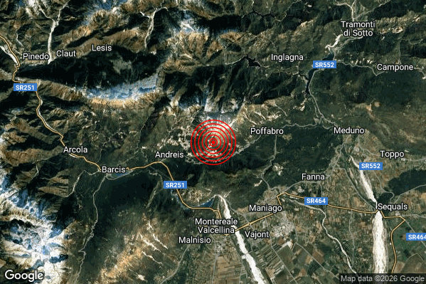 Oggi 24/01/2026 alle ore 06:36:56 (ora locale Italiana – 05:36:56 UTC) è stato registrato un Leggero #Terremoto di magnitudo M2.9 con epicentro “3 km E Andreis (PN)” Latitudine: 46.21 Longitudine: 12.66 mostrato sulla mappa.