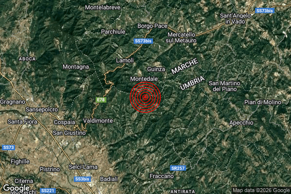 Oggi 24/01/2026 alle ore 21:17:13 (ora locale Italiana – 20:17:13 UTC) è stato registrato un Lieve #Terremoto di magnitudo M2.0 con epicentro “8 km SW Mercatello sul Metauro (PU)” Latitudine: 43.59 Longitudine: 12.28 mostrato sulla mappa.