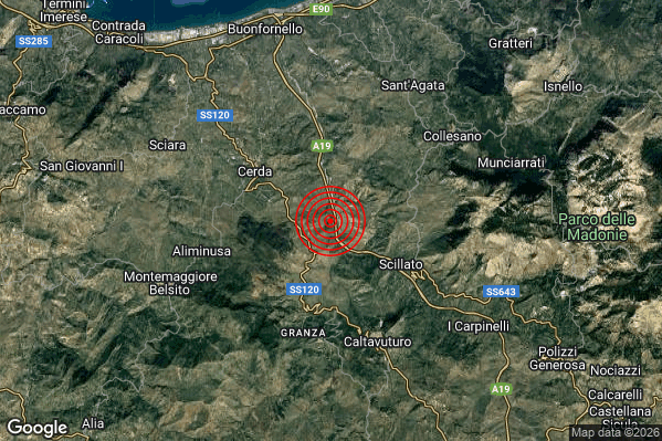 Oggi 25/01/2026 alle ore 16:52:57 (ora locale Italiana – 15:52:57 UTC) è stato registrato un Lieve #Terremoto di magnitudo M2.1 con epicentro “5 km NW Scillato (PA)” Latitudine: 37.88 Longitudine: 13.86 mostrato sulla mappa.