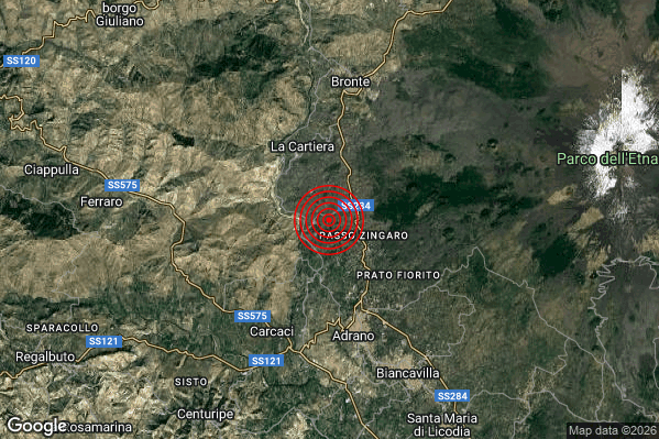 Oggi 26/01/2026 alle ore 21:40:05 (ora locale Italiana – 20:40:05 UTC) è stato registrato un Lieve #Terremoto di magnitudo M2.1 con epicentro “7 km N Adrano (CT)” Latitudine: 37.72 Longitudine: 14.82 mostrato sulla mappa.