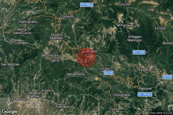 Oggi 27/01/2026 alle ore 11:34:24 (ora locale Italiana – 10:34:24 UTC) è stato registrato un Lieve #Terremoto di magnitudo M2.1 con epicentro “2 km SW Carlopoli (CZ)” Latitudine: 39.04 Longitudine: 16.44 mostrato sulla mappa.