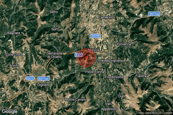 Oggi 30/01/2026 alle ore 02:26:02 (ora locale Italiana – 01:26:02 UTC) è stato registrato un Lieve #Terremoto di magnitudo M2.0 con epicentro “2 km SW Muccia (MC)” Latitudine: 43.07 Longitudine: 13.03 mostrato sulla mappa.