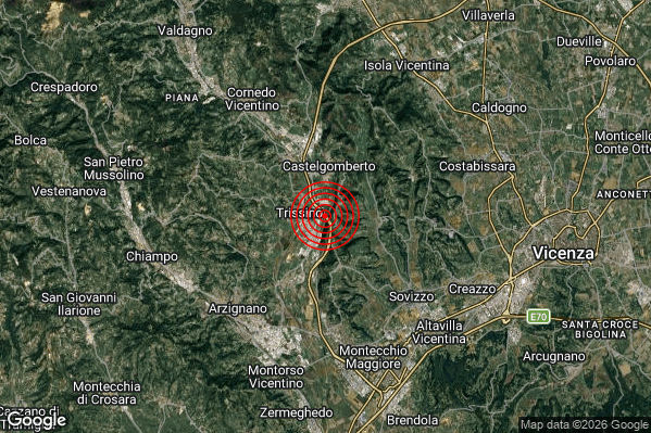 Oggi 30/01/2026 alle ore 05:40:35 (ora locale Italiana – 04:40:35 UTC) è stato registrato un Debole #Terremoto di magnitudo M2.5 con epicentro “1 km E Trissino (VI)” Latitudine: 45.56 Longitudine: 11.39 mostrato sulla mappa.