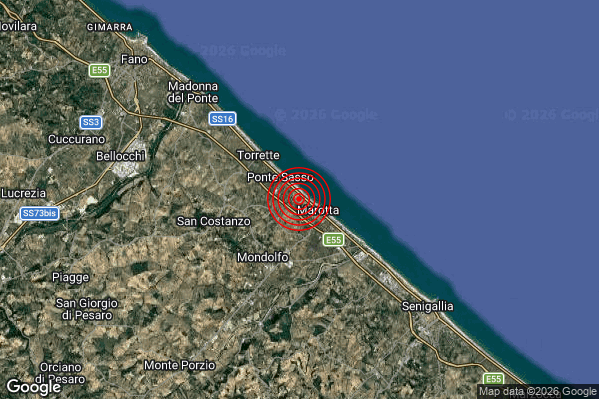 Oggi 04/02/2026 alle ore 04:03:10 (ora locale Italiana – 03:03:10 UTC) è stato registrato un Debole #Terremoto di magnitudo M2.5 con epicentro “3 km NE Mondolfo (PU)” Latitudine: 43.77 Longitudine: 13.13 mostrato sulla mappa.