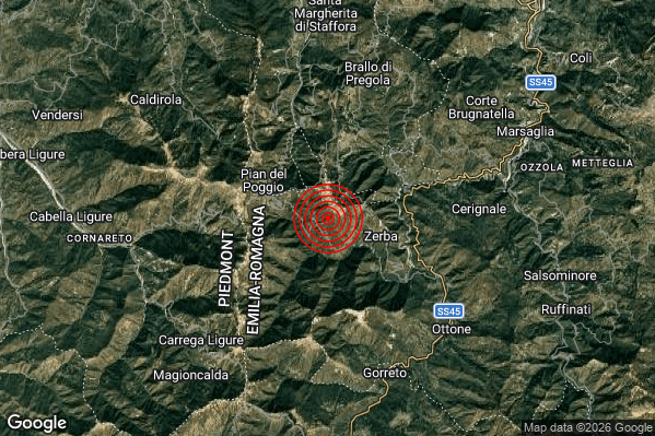 Oggi 05/02/2026 alle ore 03:03:22 (ora locale Italiana – 02:03:22 UTC) è stato registrato un Lieve #Terremoto di magnitudo M2.1 con epicentro “3 km W Zerba (PC)” Latitudine: 44.67 Longitudine: 9.26 mostrato sulla mappa.
