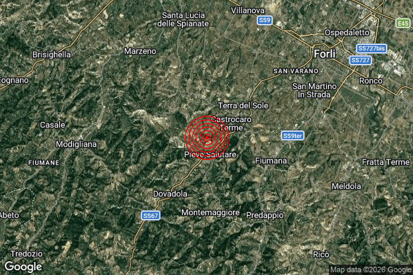 Oggi 08/02/2026 alle ore 13:07:00 (ora locale Italiana – 12:07:00 UTC) è stato registrato un Debole #Terremoto di magnitudo M2.4 con epicentro “3 km SW Castrocaro Terme e Terra del Sole (FC)” Latitudine: 44.16 Longitudine: 11.92 mostrato sulla mappa.