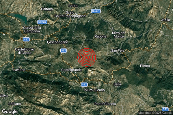 Oggi 13/02/2026 alle ore 04:18:42 (ora locale Italiana – 03:18:42 UTC) è stato registrato un Lieve #Terremoto di magnitudo M2.0 con epicentro “4 km NE Castelgrande (PZ)” Latitudine: 40.81 Longitudine: 15.47 mostrato sulla mappa.