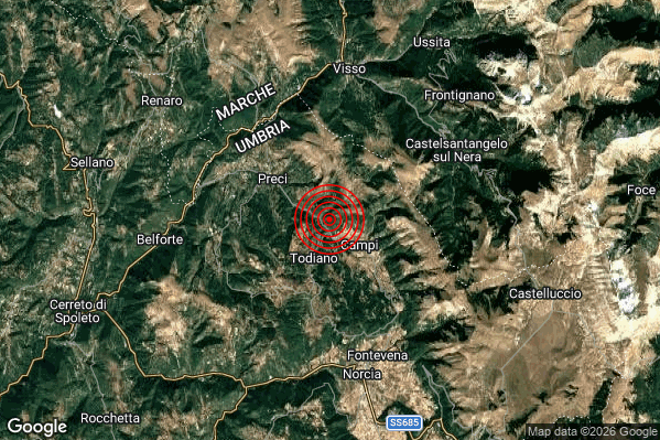 Oggi 14/02/2026 alle ore 14:06:38 (ora locale Italiana – 13:06:38 UTC) è stato registrato un Lieve #Terremoto di magnitudo M2.0 con epicentro “3 km SE Preci (PG)” Latitudine: 42.86 Longitudine: 13.07 mostrato sulla mappa.