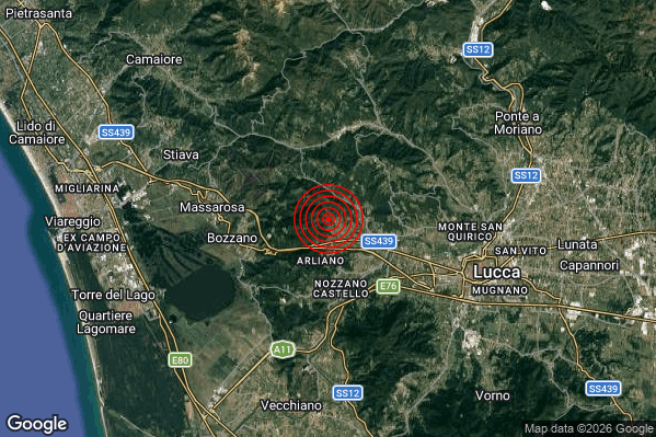 Oggi 17/02/2026 alle ore 23:10:01 (ora locale Italiana – 22:10:01 UTC) è stato registrato un Lieve #Terremoto di magnitudo M2.0 con epicentro “5 km E Massarosa (LU)” Latitudine: 43.87 Longitudine: 10.41 mostrato sulla mappa.
