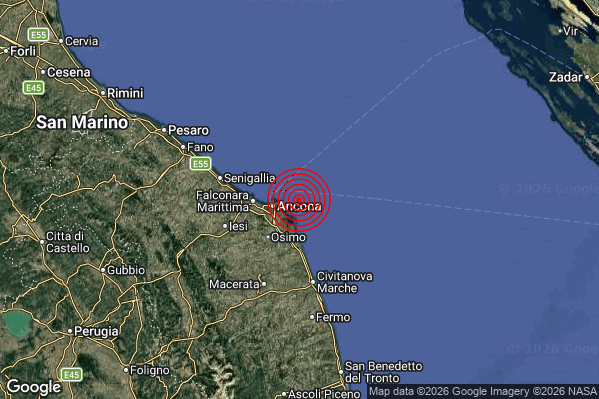 Oggi 23/02/2026 alle ore 04:33:06 (ora locale Italiana – 03:33:06 UTC) è stato registrato un Lieve #Terremoto di magnitudo M2.2 con epicentro “Costa Marchigiana Anconetana (Ancona)” Latitudine: 43.64 Longitudine: 13.65 mostrato sulla mappa.