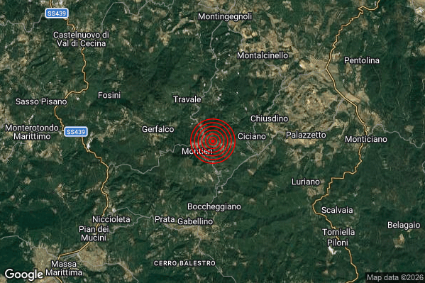 Oggi 23/02/2026 alle ore 07:36:09 (ora locale Italiana – 06:36:09 UTC) è stato registrato un Lieve #Terremoto di magnitudo M2.2 con epicentro “1 km NE Montieri (GR)” Latitudine: 43.14 Longitudine: 11.03 mostrato sulla mappa.