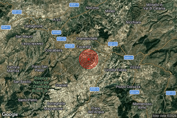 Oggi 24/02/2026 alle ore 14:56:19 (ora locale Italiana – 13:56:19 UTC) è stato registrato un Lieve #Terremoto di magnitudo M2.0 con epicentro “4 km S Grammichele (CT)” Latitudine: 37.18 Longitudine: 14.64 mostrato sulla mappa.
