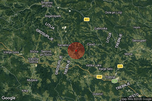 Oggi 25/02/2026 alle ore 10:06:54 (ora locale Italiana – 09:06:54 UTC) è stato registrato un Lieve #Terremoto di magnitudo M2.1 con epicentro “Slovenia (SLOVENIA)” Latitudine: 45.96 Longitudine: 14.92 mostrato sulla mappa.