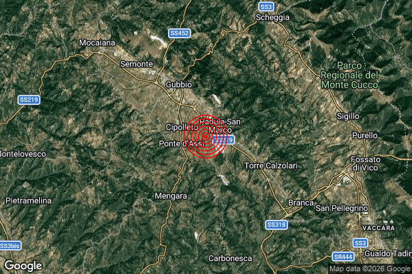 Oggi 27/02/2026 alle ore 14:23:16 (ora locale Italiana – 13:23:16 UTC) è stato registrato un Lieve #Terremoto di magnitudo M2.1 con epicentro “5 km SE Gubbio (PG)” Latitudine: 43.32 Longitudine: 12.6 mostrato sulla mappa.