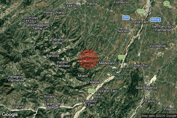 Oggi 28/02/2026 alle ore 05:59:55 (ora locale Italiana – 04:59:55 UTC) è stato registrato un Debole #Terremoto di magnitudo M2.6 con epicentro “4 km W Medesano (PR)” Latitudine: 44.76 Longitudine: 10.1 mostrato sulla mappa.