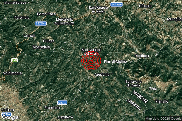 Oggi 28/02/2026 alle ore 18:02:45 (ora locale Italiana – 17:02:45 UTC) è stato registrato un Lieve #Terremoto di magnitudo M2.2 con epicentro “3 km NW Apecchio (PU)” Latitudine: 43.58 Longitudine: 12.39 mostrato sulla mappa.