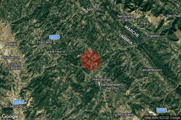 Oggi 28/02/2026 alle ore 22:27:28 (ora locale Italiana – 21:27:28 UTC) è stato registrato un Debole #Terremoto di magnitudo M2.3 con epicentro “4 km NW Pietralunga (PG)” Latitudine: 43.47 Longitudine: 12.41 mostrato sulla mappa.