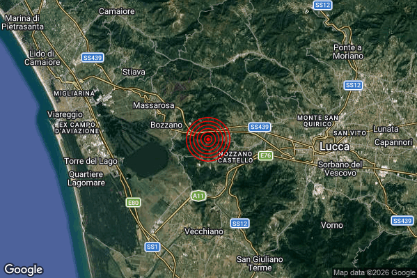 Oggi 01/03/2026 alle ore 19:22:04 (ora locale Italiana – 18:22:04 UTC) è stato registrato un Debole #Terremoto di magnitudo M2.5 con epicentro “5 km SE Massarosa (LU)” Latitudine: 43.85 Longitudine: 10.39 mostrato sulla mappa.
