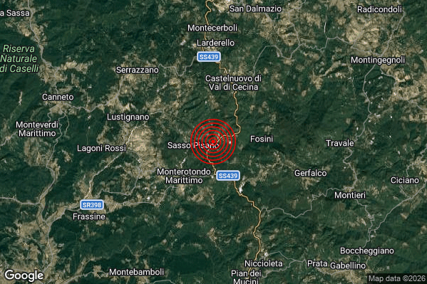 Oggi 02/03/2026 alle ore 07:50:52 (ora locale Italiana – 06:50:52 UTC) è stato registrato un Lieve #Terremoto di magnitudo M2.0 con epicentro “3 km NE Monterotondo Marittimo (GR)” Latitudine: 43.17 Longitudine: 10.88 mostrato sulla mappa.