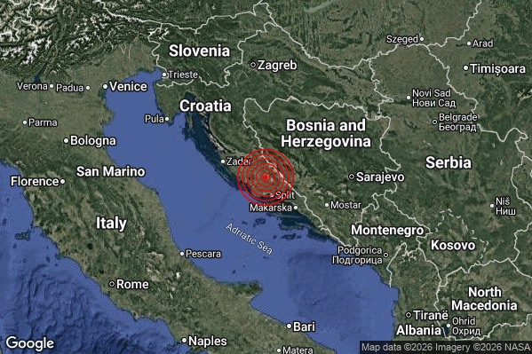 Oggi 04/03/2026 alle ore 01:23:14 (ora locale Italiana – 00:23:14 UTC) è stato registrato un Distinto #Terremoto di magnitudo M3.8 con epicentro “Croatia [Land]” Latitudine: 43.85 Longitudine: 16.27 mostrato sulla mappa.