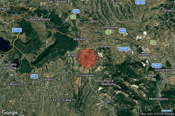 Oggi 06/03/2026 alle ore 00:23:43 (ora locale Italiana – 23:23:43 UTC) è stato registrato un Lieve #Terremoto di magnitudo M2.1 con epicentro “3 km E Lariano (RM)” Latitudine: 41.72 Longitudine: 12.87 mostrato sulla mappa.