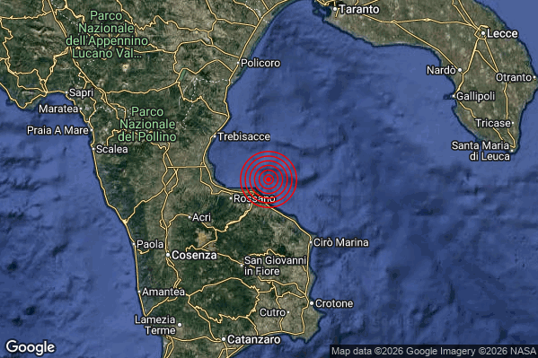 Oggi 06/03/2026 alle ore 14:21:59 (ora locale Italiana – 13:21:59 UTC) è stato registrato un Distinto #Terremoto di magnitudo M3.9 con epicentro “Costa Ionica Cosentina (Cosenza)” Latitudine: 39.67 Longitudine: 16.86 mostrato sulla mappa.