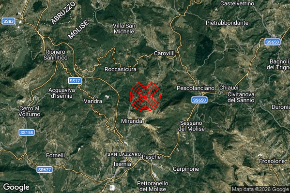 Oggi 06/03/2026 alle ore 21:56:02 (ora locale Italiana – 20:56:02 UTC) è stato registrato un Lieve #Terremoto di magnitudo M2.1 con epicentro “3 km NE Miranda (IS)” Latitudine: 41.67 Longitudine: 14.27 mostrato sulla mappa.
