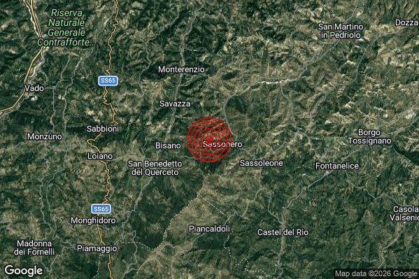 Oggi 08/03/2026 alle ore 00:08:32 (ora locale Italiana – 23:08:32 UTC) è stato registrato un Lieve #Terremoto di magnitudo M2.2 con epicentro “6 km SE Monterenzio (BO)” Latitudine: 44.28 Longitudine: 11.43 mostrato sulla mappa.
